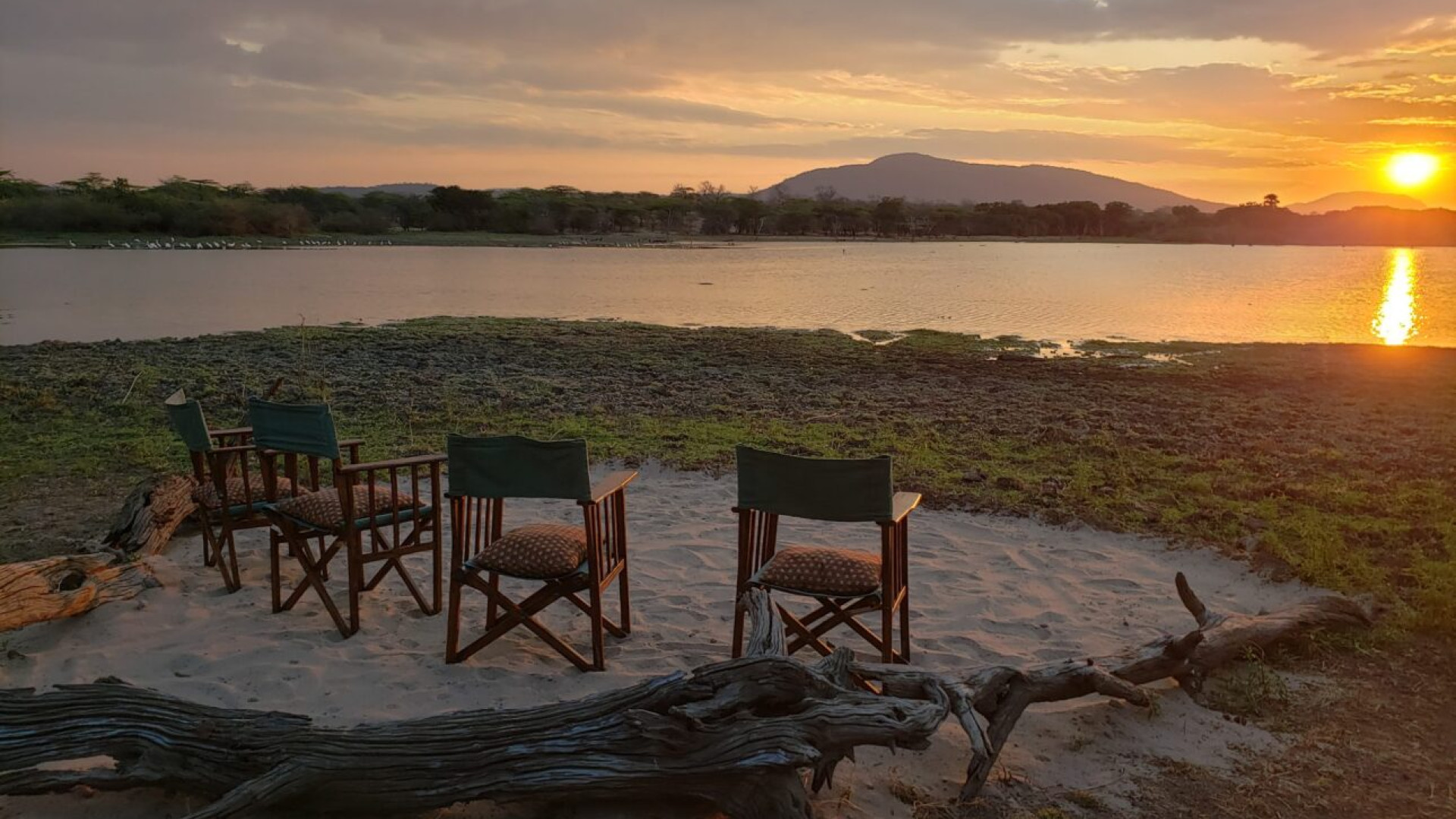 Når solen nærmer seg horisonten i vest og lyser opp himmelen i gull og karmosinrødt over vannhullet, står silhuetter av dyr mot horisonten og markerer overgangen til kvelden. Et skue. Stemningen skifter naturlig og forbereder deg på natten som er rett rundt hjørnet.