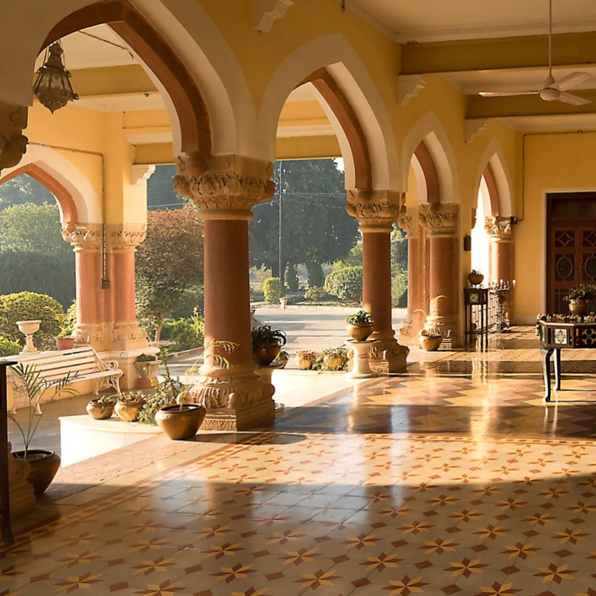 Gutta i kakibrune uniformer og beret hilser gjenkjennende. Velkomstdrink og velkommen i salongen. Innsjekk på rommet mitt. Ut igjen til oasen, gårdsplassen, som er selve hjertet i fyrstepalasset.