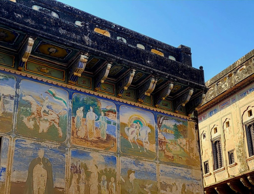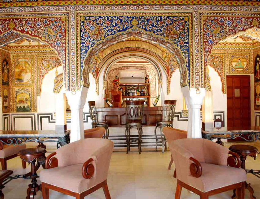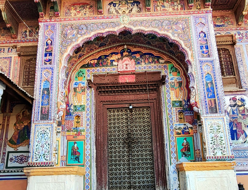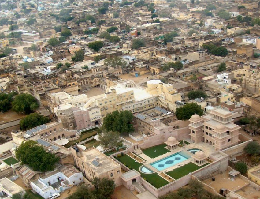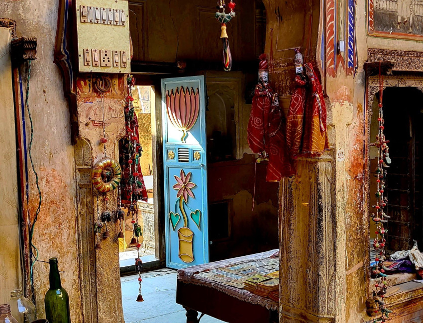 Bortover en gang. Opp en trapp. To trapper. Dekorerte vegger og tak rundt baut. Vi skrur tiden tilbake, sånn cirka 250 år. Så er vi på taket. Takterrassen. Flere takterrasser. Kriker og kroker. Utsikt over Mandawas små, travle gater. Flatt landskap. Ørken, men dottet med grønne trær. Det føles som å være i en oase on the top of the world her oppe. Og når vår blide omviser dukker opp med et glass med sprudlende dråper idet solen blir rød i vest, ja, da kjennes det som om jeg er midt i et indisk eventyr.