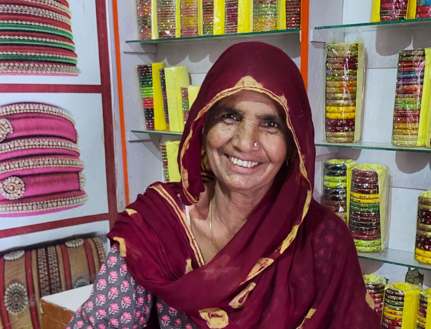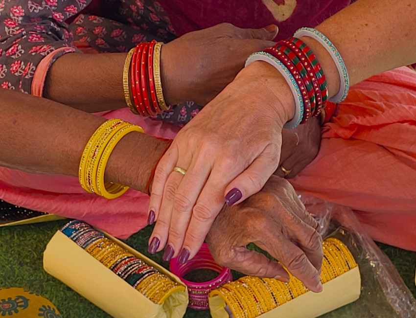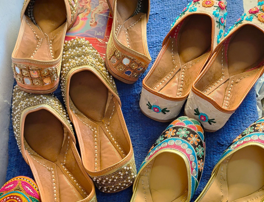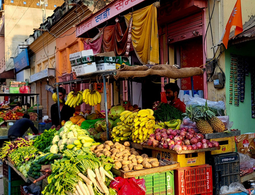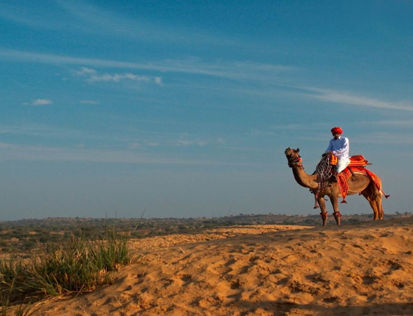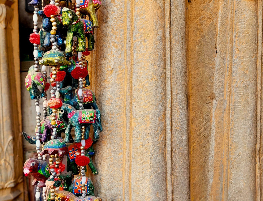 Bortover en gang. Opp en trapp. To trapper. Dekorerte vegger og tak rundt baut. Vi skrur tiden tilbake, sånn cirka 250 år. Så er vi på taket. Takterrassen. Flere takterrasser. Kriker og kroker. Utsikt over Mandawas små, travle gater. Flatt landskap. Ørken, men dottet med grønne trær. Det føles som å være i en oase on the top of the world her oppe. Og når vår blide omviser dukker opp med et glass med sprudlende dråper idet solen blir rød i vest, ja, da kjennes det som om jeg er midt i et indisk eventyr.