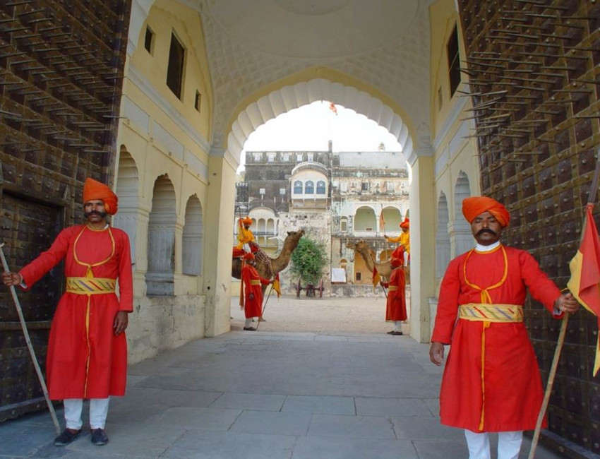 Vi kjører inn porten. Stramme menn i oransje turban og snurrebart ønsker oss velkommen. Slottsplassen omsluttes av noe veldig flott og noe ikke fullt så flott. Vel halvparten av slottet er pusset opp og vedlikeholdt. Den andre halvdelen, not so much. Det er den delen som er pusset opp som fungerer som hotell i dag.