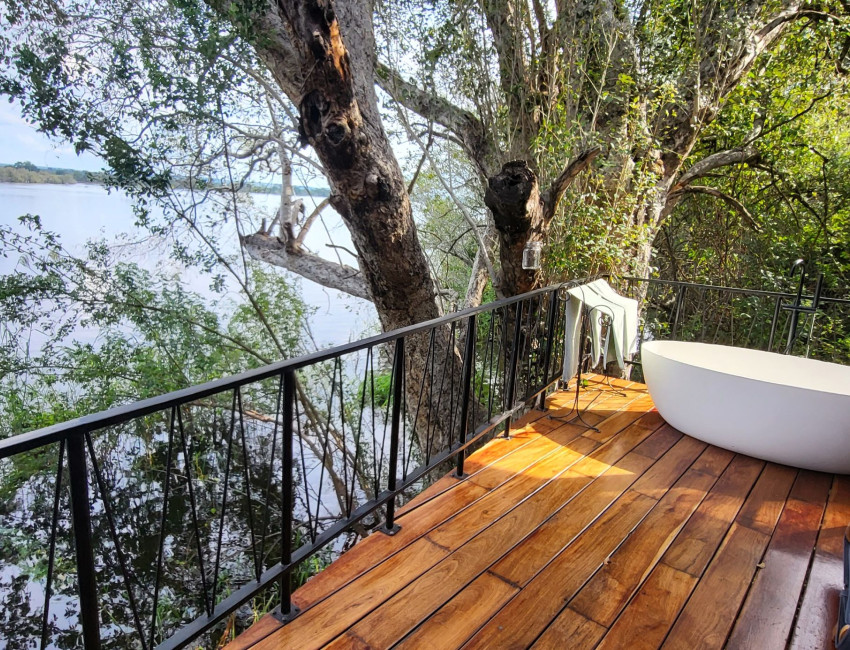 Det er ikke luksus, men rustikt og velutstyrt, til og med med badekar på terrassen. Utsikten over elven er magisk.