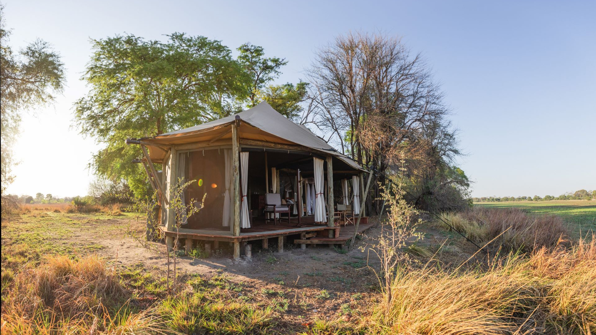 Campen har fire safaritelt. Utstyrt med komfortable enkeltsenger, eget friluftsbad med dusj og toalett. Og utenfor teltet kan du slappe av i en safaristol. Teltene har tregulv og utsikt over lagunen. Her kommer du skikkelig tilbake til røttene.