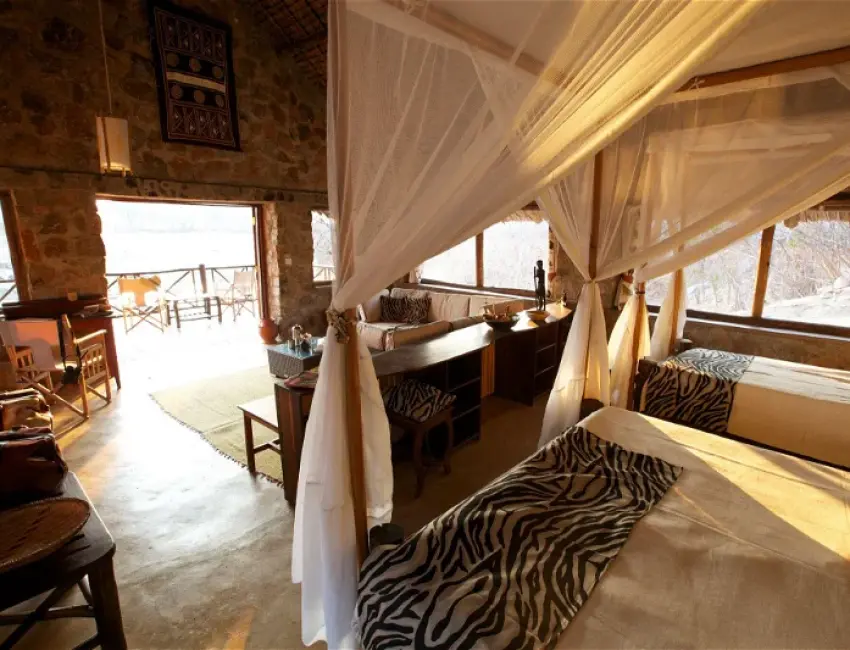 Ruaha River Lodge er den eneste "lodgen" i Ruaha, og består av 24 steinhytter som strekker seg langs elvebredden. Alle hyttene har fantastisk utsikt fra en stor veranda på forsiden, og de store rommene har sittegruppe, skrivebord og enten enkeltsenger eller dobbeltsenger. På baksiden av hver hytte er det et stort bad innredet med treverk, dusj og doble servanter.