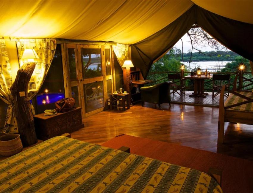 Du kan bo i klassiske telt som ligger langs elvebredden. De har stråtak og store verandaer med utsikt oppover og nedover elven. Hvert av de elleve teltene har eget bad med soloppvarmet vann til dusjen.