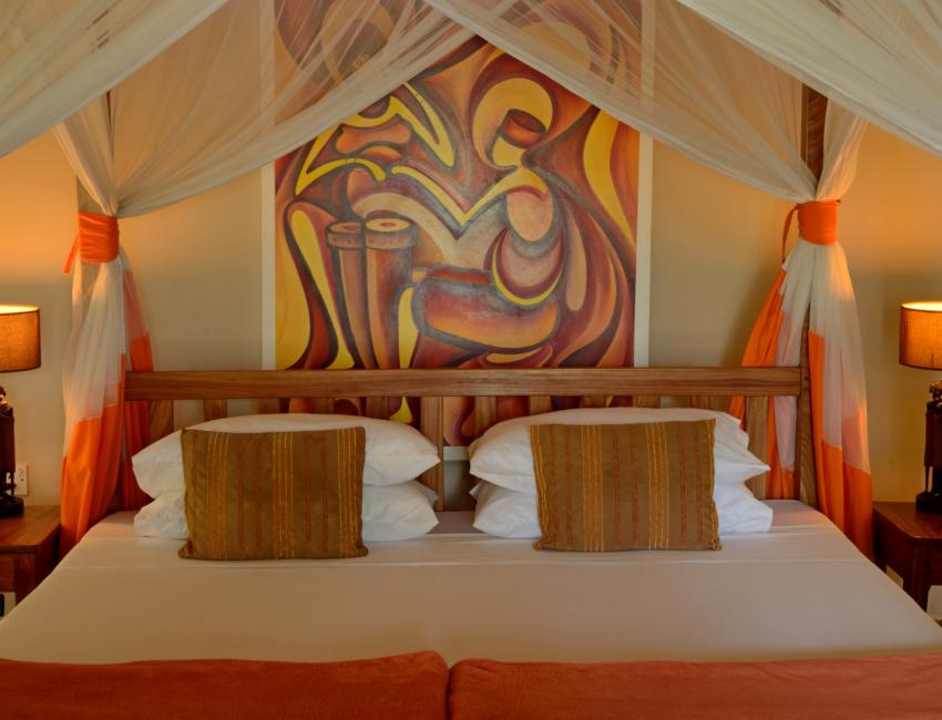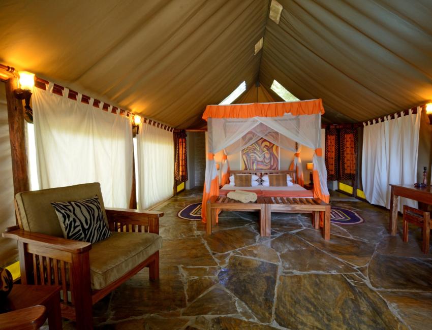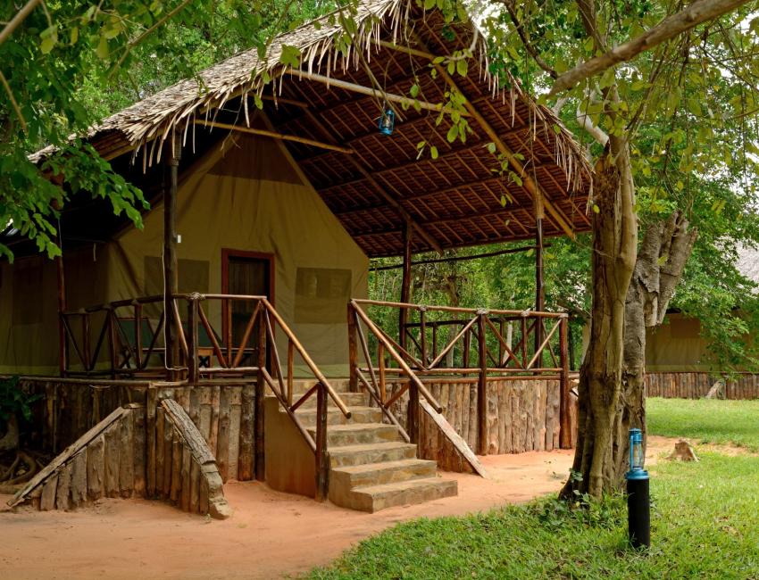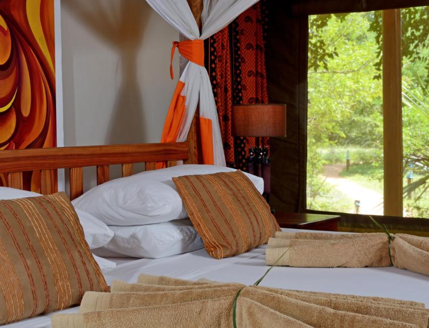 Teltene er komfortable og romslige, laget av lerret og har stråtak. De er fargerikt innredet og er plassert på en opphøyet treplatting. Eget bad med vannklosett og en romslig veranda der du har orkesterplass til dyrelivet nede ved elveleiet.
