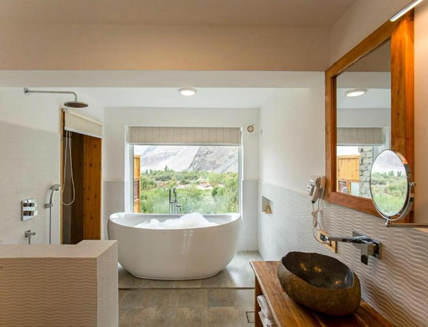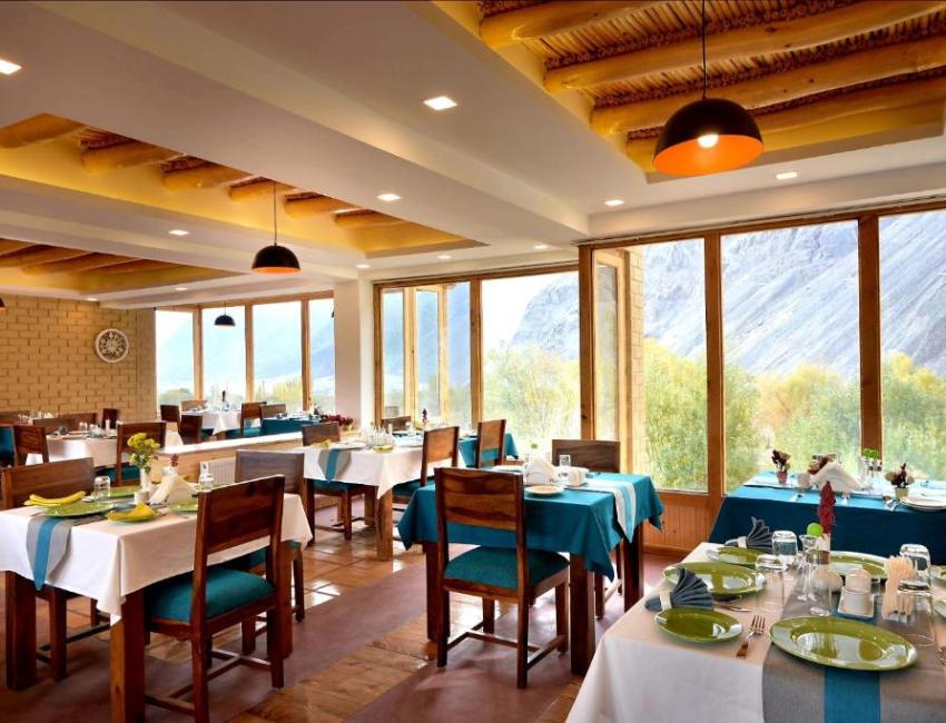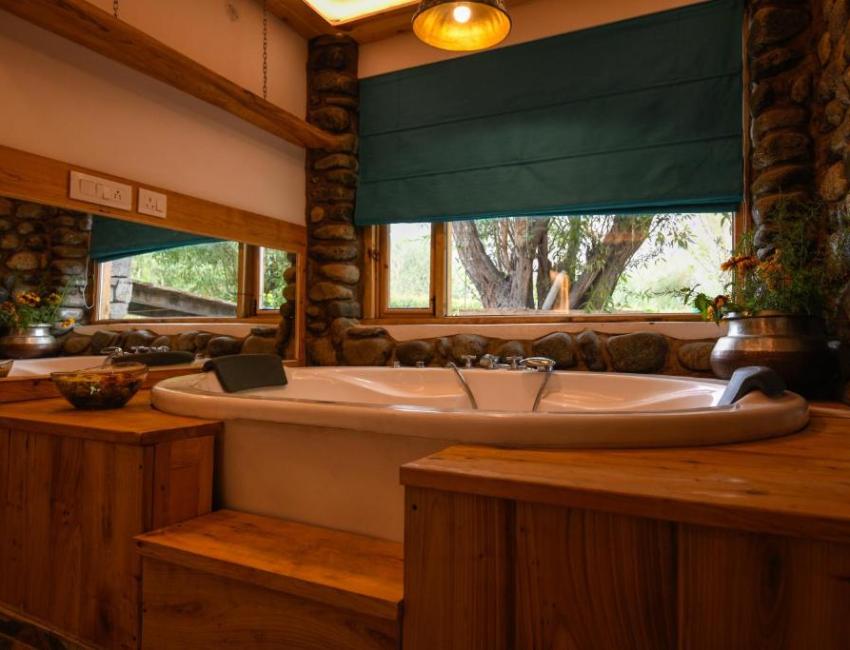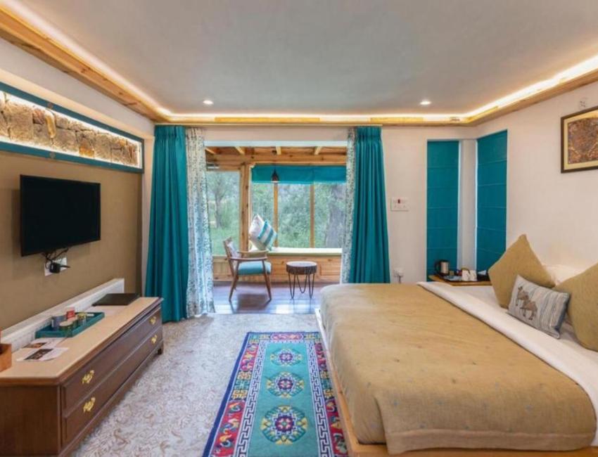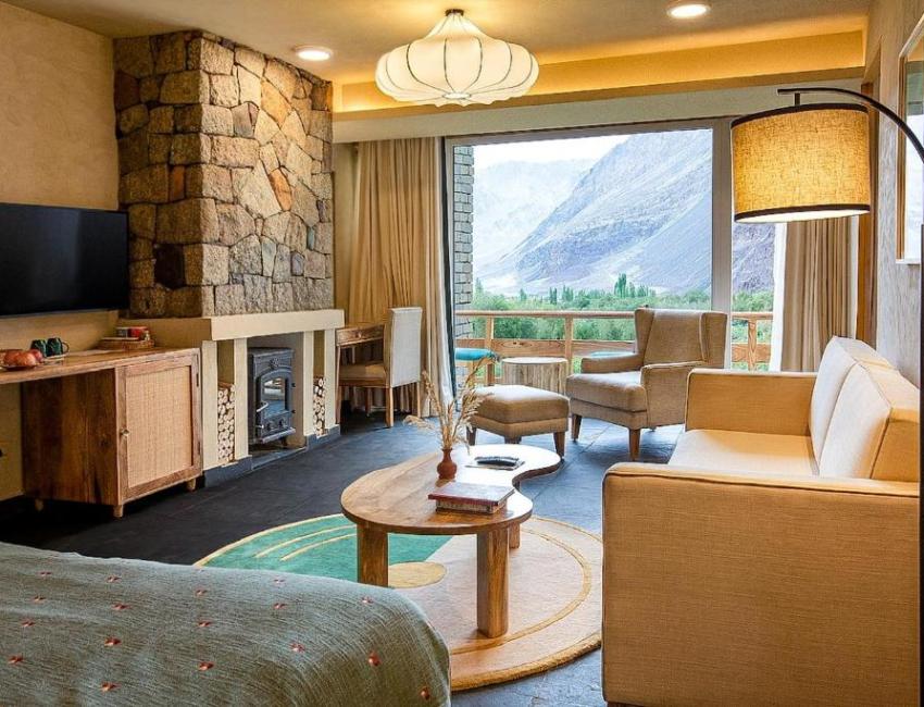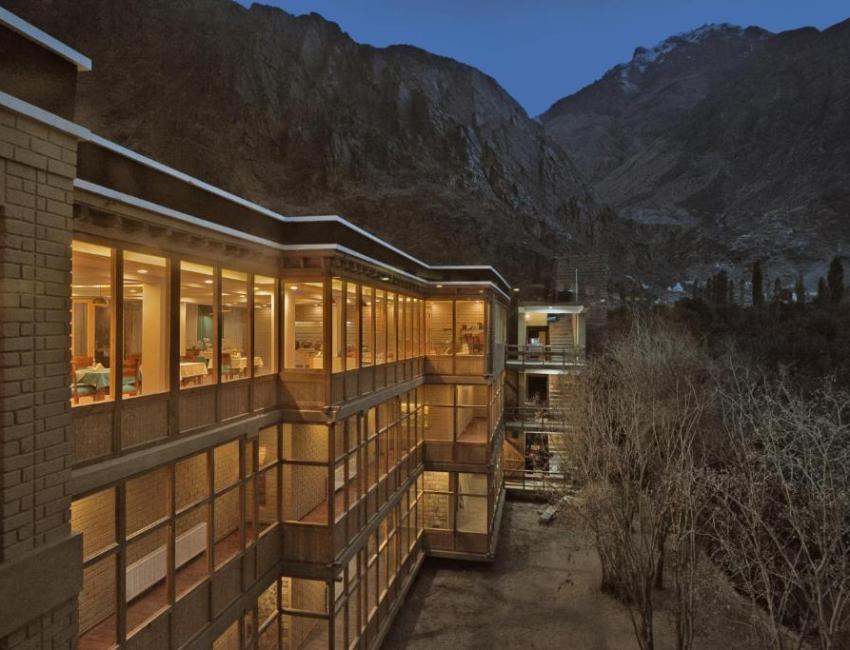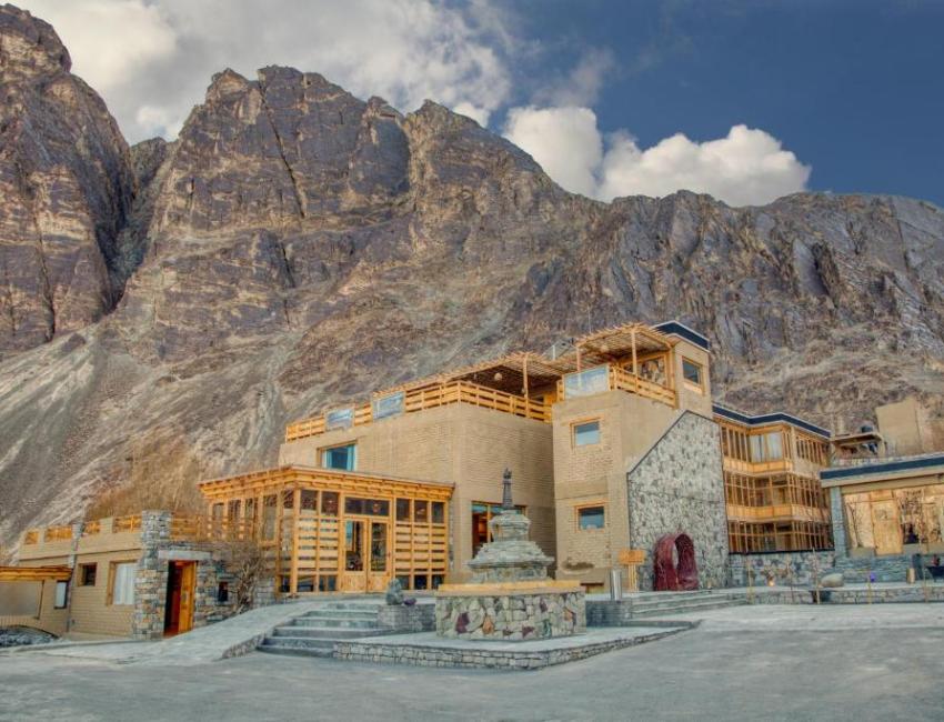 Hotellet ble bygget i 2018 og smyger seg naturlig inn i det barske landskapet både når det gjelder form og farger. Eksteriøret er selje, poppel og leire, lokalt tømmer, mange varianter av små og store steiner samt betong. På innsiden er tradisjonene holdt i hevd også der, med blant annet håndvevde tekstiler. Vinduene er store slik at naturen slippes inn. Rommene har god størrelse og turkis er fargen som piffer opp jordfargene.
