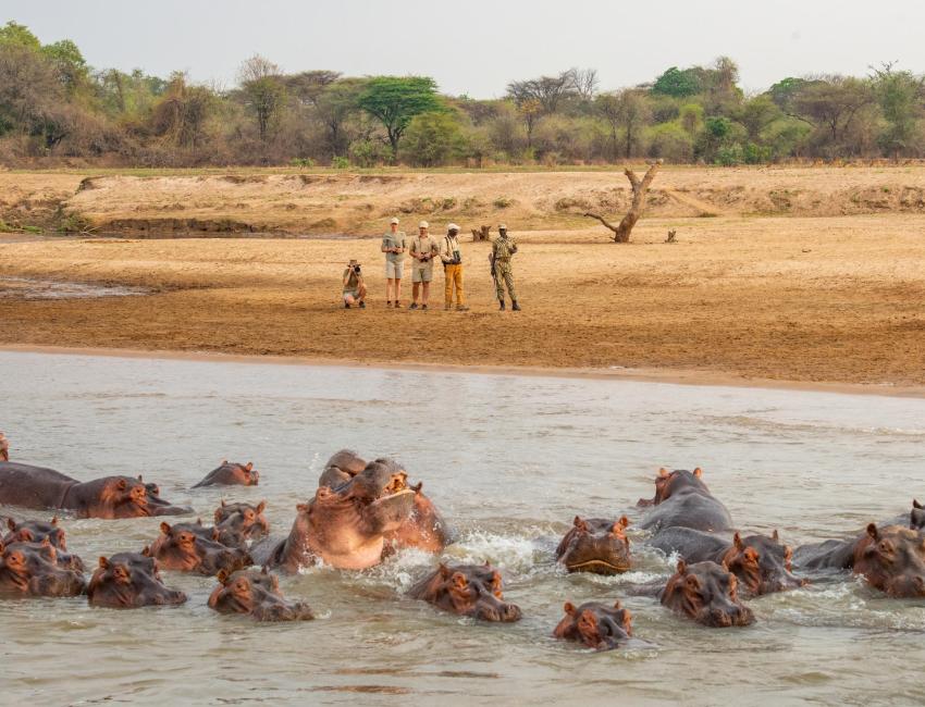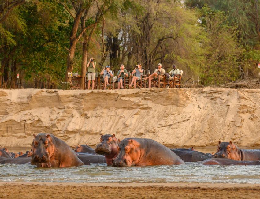 Utsikten er upåklagelig. En flodhest-kulp med masse aktivitet (det bor 450 flodhester i nabolaget …) og uberørt natur på alle kanter. Her kan du oppleve bush-TV på sitt beste. Det er et yrende dyreliv i området med blant annet over 400 fuglearter, i tillegg til de store dyrene.