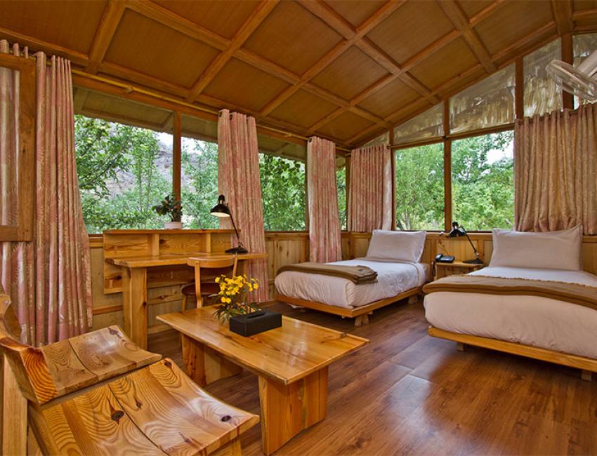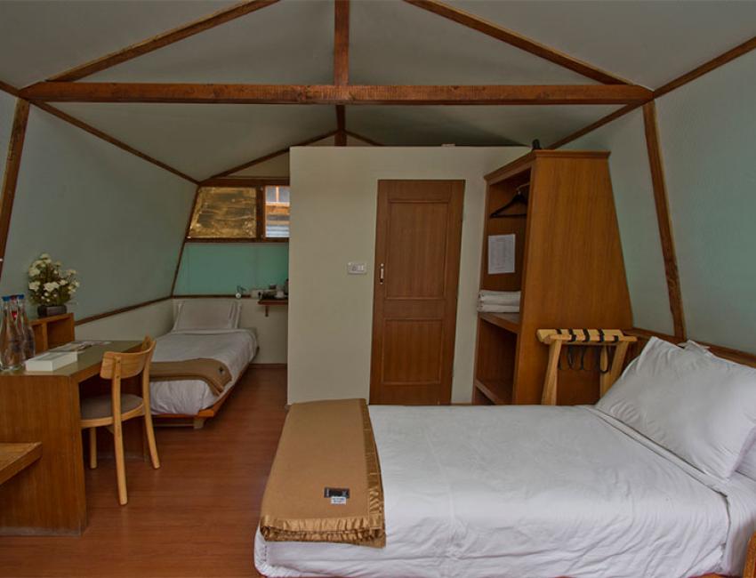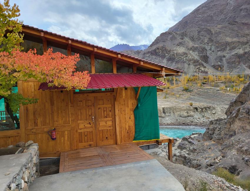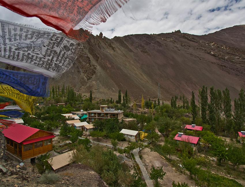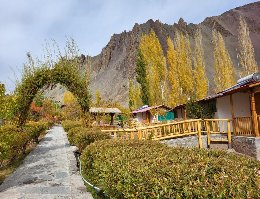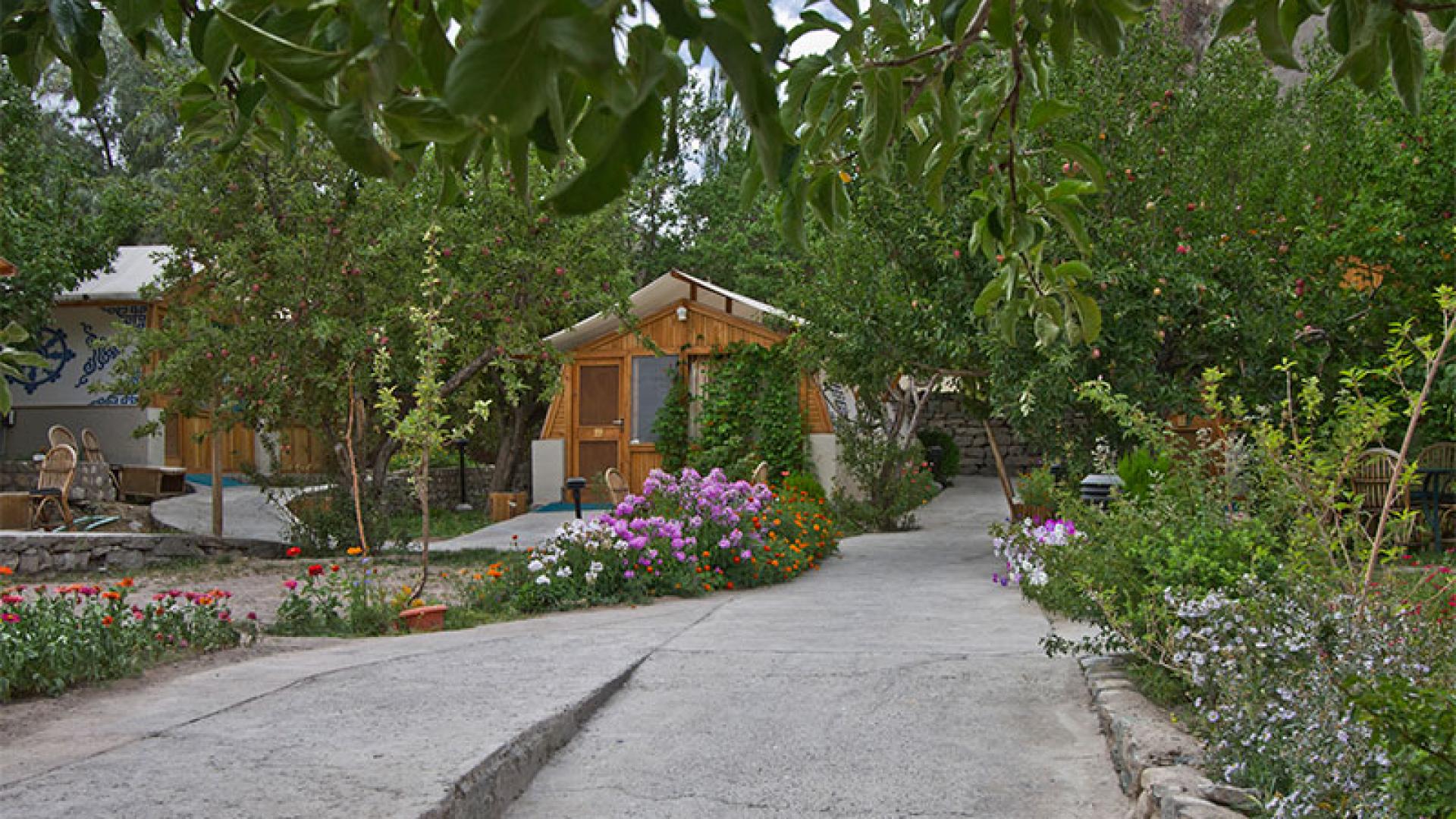 Resorten har 15 hytter (canvashyttene de også har anbefales ikke) spredt rundt i en stor hage med blant annet mange aprikostrær. Her dyrkes grønnsaker og elektrisiteten kommer fra solen. Beliggenheten ved bredden av Induselven er ganske spektakulær omkranset av høye fjell.