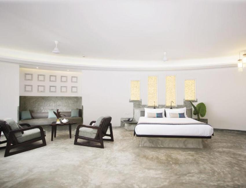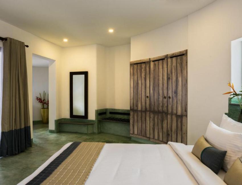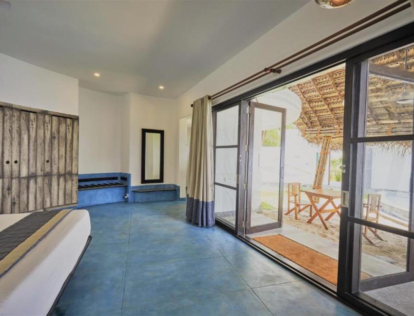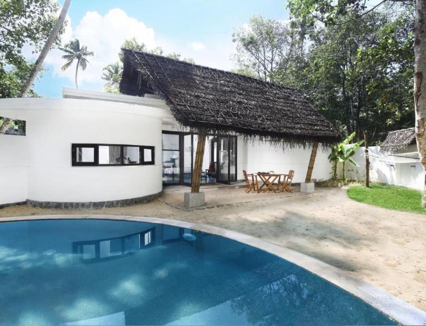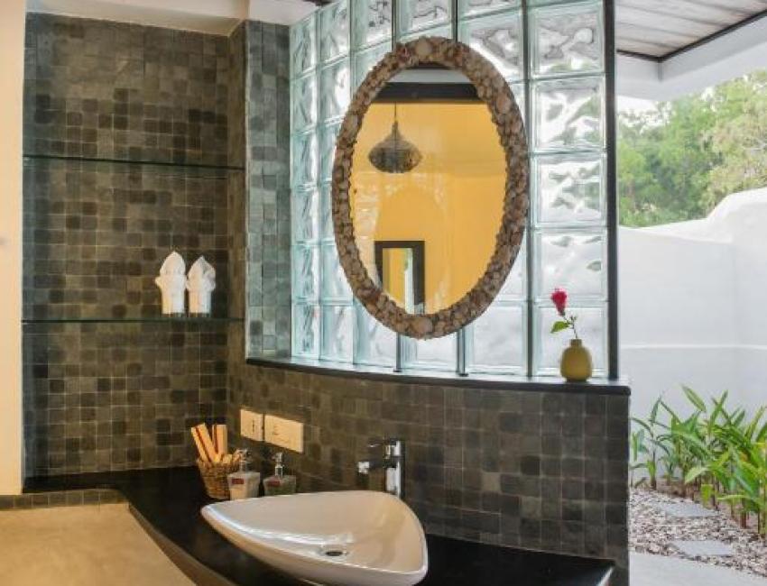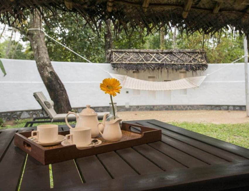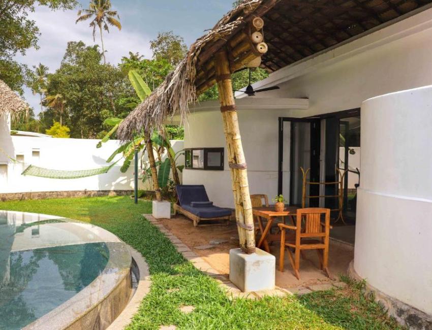 Badet er halvveis utendørs (dusj ute, badekar inne) og alle villaene har hage, hengekøye, gress og sandstrand. Villaene, som har stråtak, er romslige og kjøleskapet er fylt med hjemmelagde juicer. Hagen har en buet mur som omslutter "østersen", og jeg kan love deg at det å ligge i hengekøyen om kvelden og høre kakofonien av fugler og se opp på stjernehimmelen, det er balsam for sjelen. Noen av villa-kategoriene har et lite basseng i hagen.