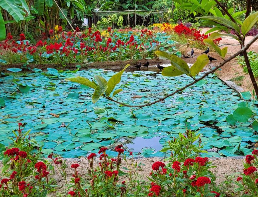 Xandari har fokus på kortreist og organisk mat, så her er det fra jord til bord som gjelder. Gården med dyrene ligger like ved, men du merker dem ikke dersom du ikke går på besøk. Hagen bugner av grønnsaker og fruktplanter, ris- og banantrær. De har også en egen sommerfuglhage. Det er balsam for sjelen å vandre rundt i disse omgivelsene. En eksplosjon av farger og naturens lyder. Blomster, trær, frukt, grønnsaker, dammer og innsjø, sommerfugler og fugler i skjønn forening.