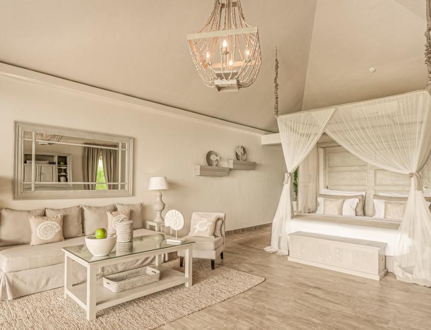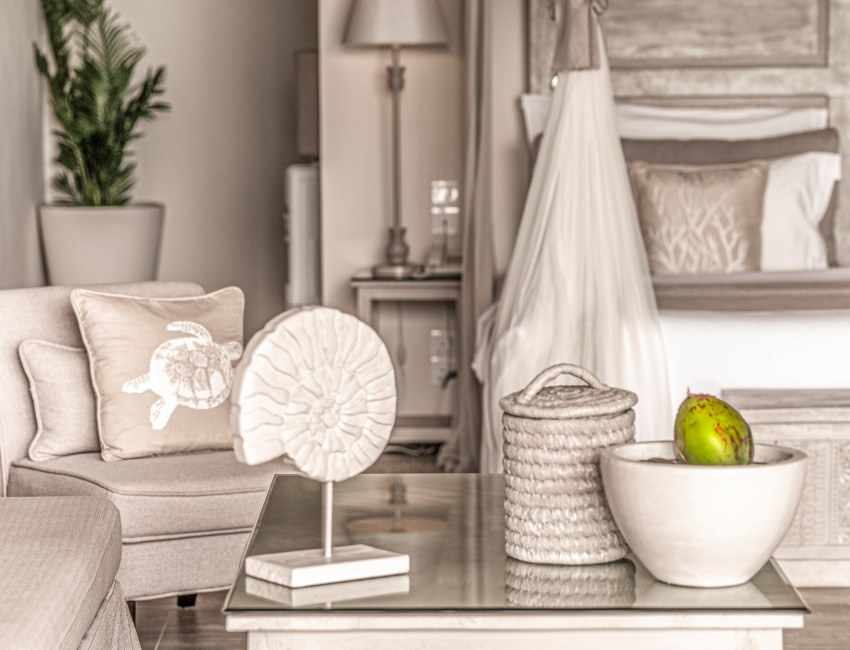 Stilen er avslappet og elegant, perfekt for en strandferie. Foran bassenget lager klippene en bukt som gjemmer en kritthvit strand. Herfra kan du bade og snorkle hele dagen, uansett tidevann.